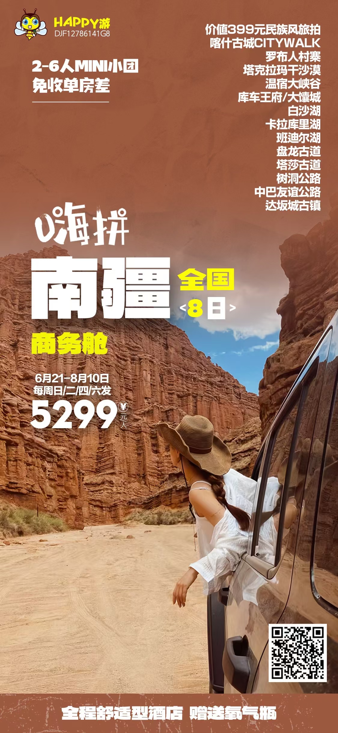 旅拍大礼包: 价值 399 元真旅拍! 含 15 张美拍图+3 张精修图, 送化妆 民俗体验 : 喀什维吾尔族风情/塔什库尔干塔吉克风情/伊犁哈萨克风情 丝路重镇: 库车王府/大馕城-阿克苏/喀什/塔县