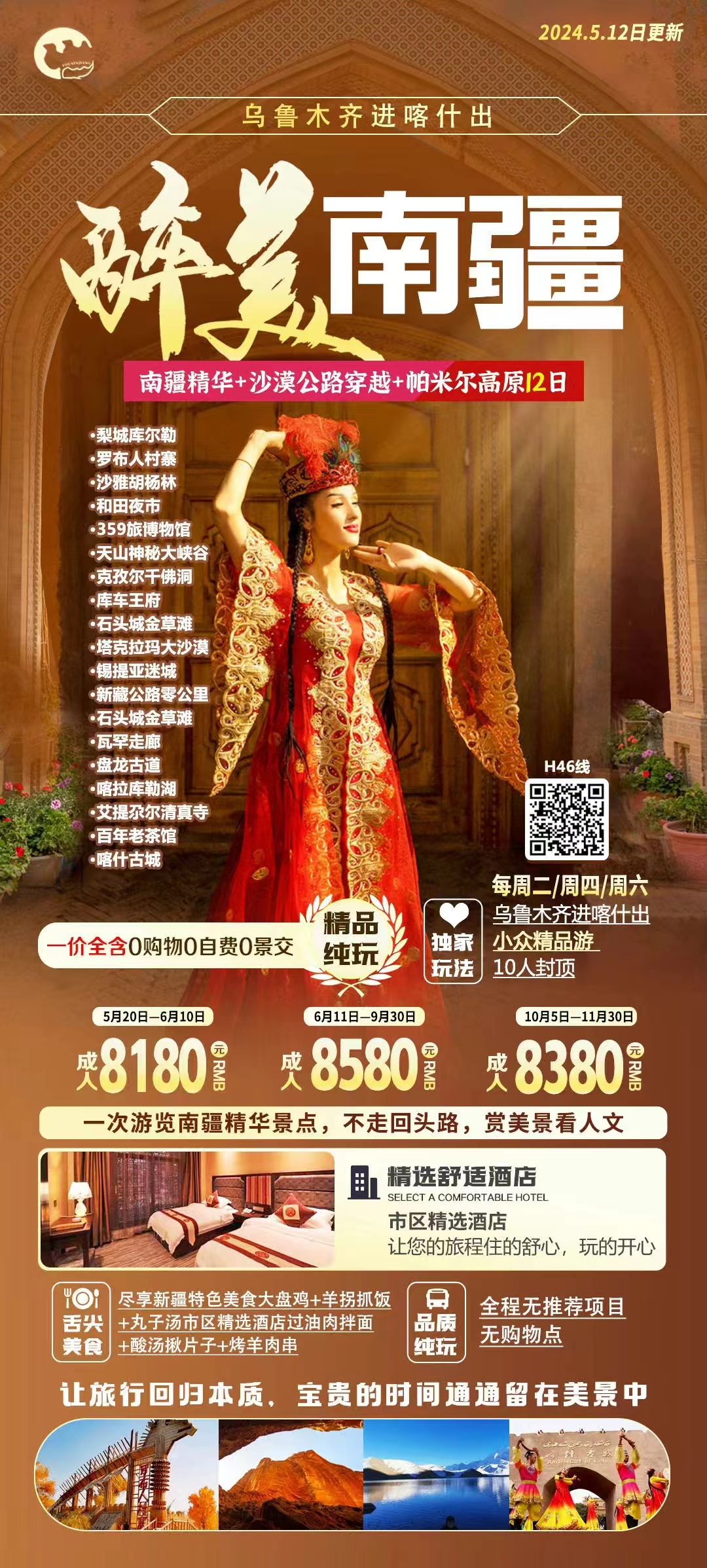 8、酒店信息:具体酒店信息,请以最终出团通知书为准。酒店外表不一定奢华,也许是商务酒店,也许是快捷酒店,但 干净卫生是首要优选条件。有极少数的在景区或偏远乡镇的住宿,因为条件有限,加上南疆一年中只有 10 月是旺季,价 高且条件艰苦,希望大家有个心理准备,期望值不要太高。