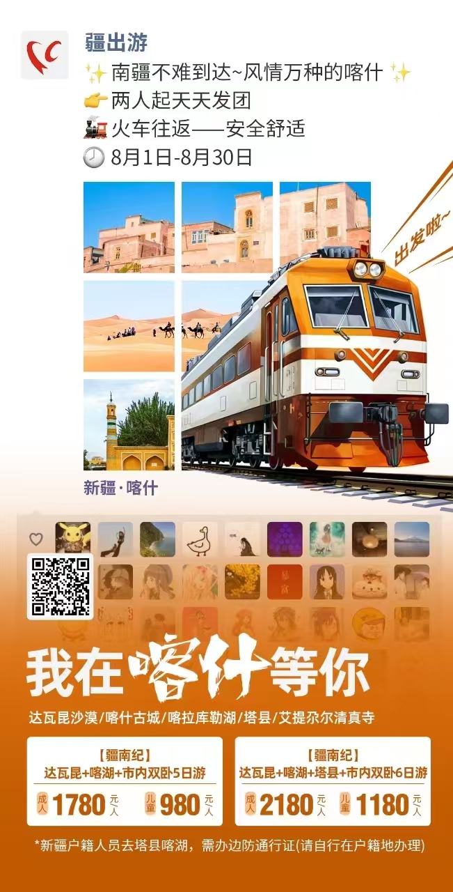 火车票:乌鲁木齐-喀什,喀什-乌鲁木齐往返火车卧铺票(不保证上中下铺) 汽车:旅游目的地旅游用车(每人确保1正座,不含旅游景区内交通工具,自由活动不含车) |